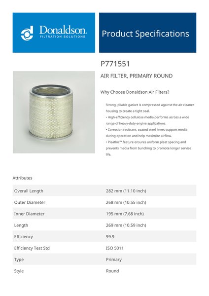 Donaldson P771551 Air Filter, Primary Round | Replaces the Virgis CH12660