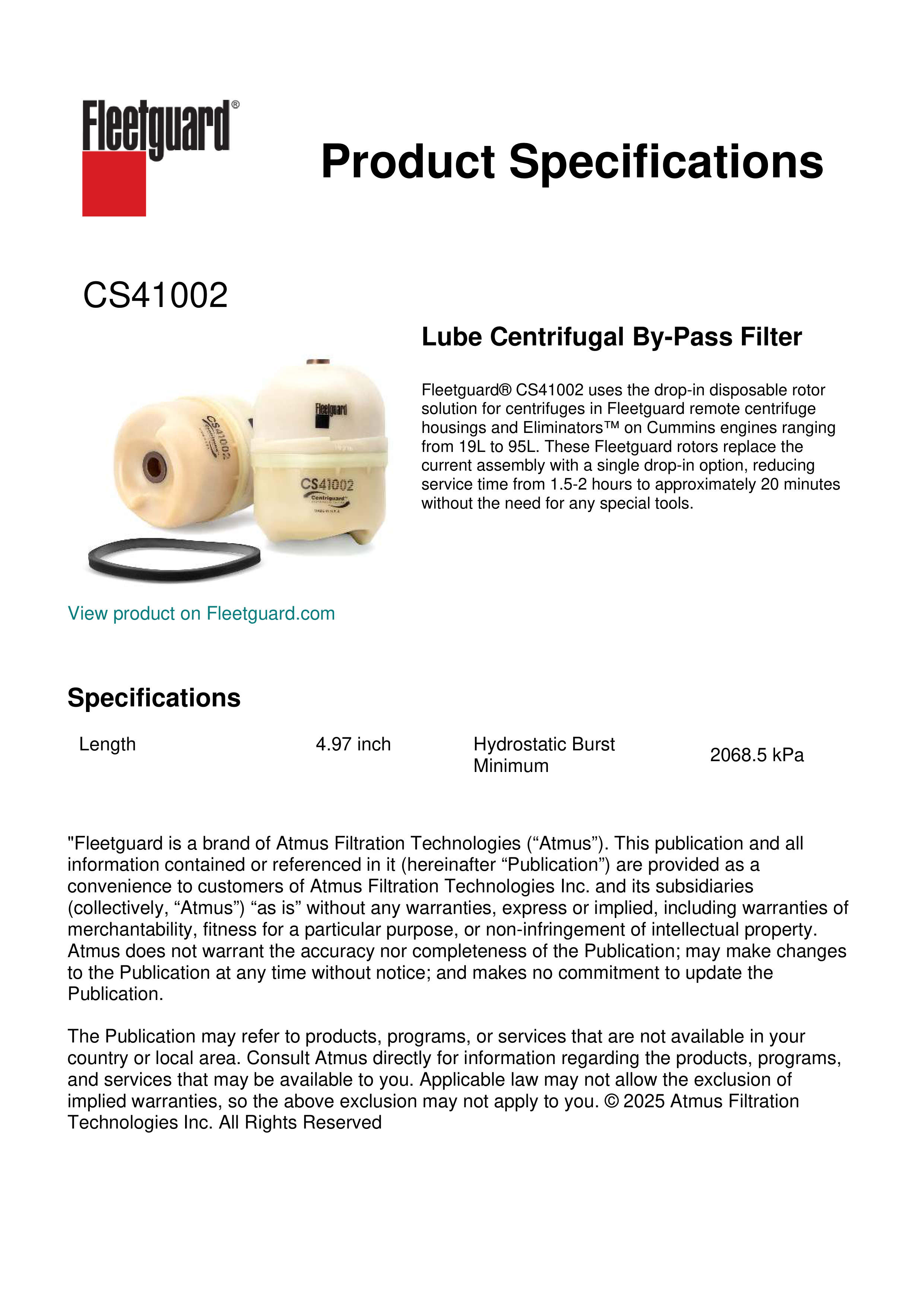 Fleetguard® CS41002 uses the drop-in disposable rotor solution for centrifuges in Fleetguard remote centrifuge housings and Eliminators™ on Cummins engines ranging from 19L to 95L. These Fleetguard rotors replace the current assembly with a single drop-in option, reducing service time from 1.5-2 hours to approximately 20 minutes without the need for any special tools.Specification