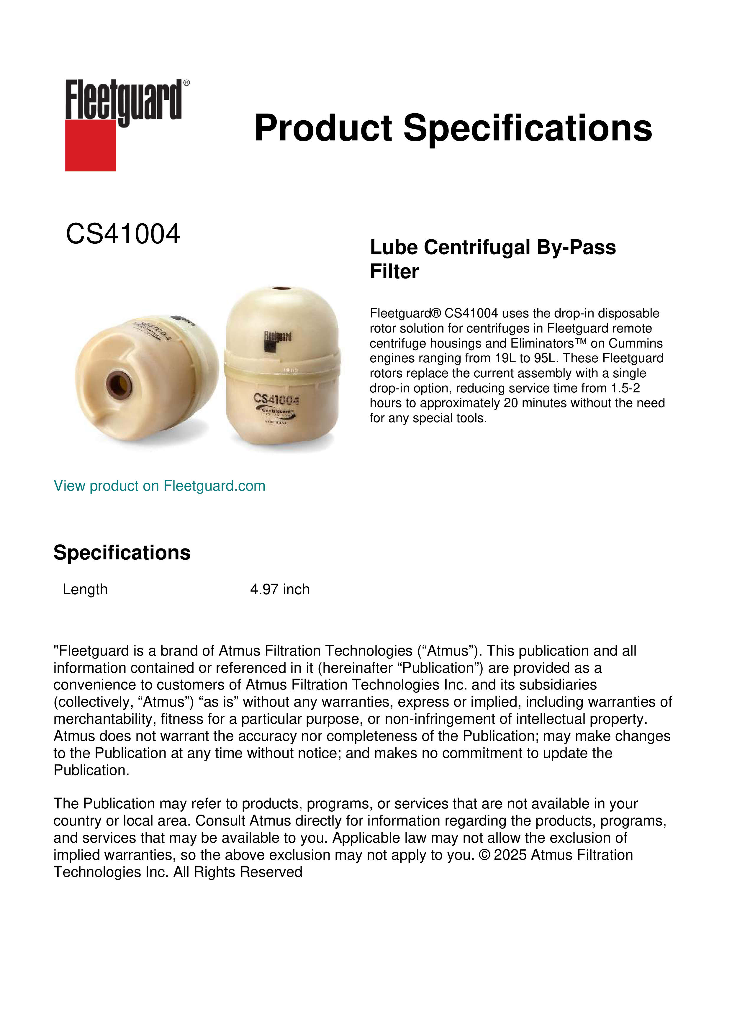 Fleetguard® CS41004 uses the drop-in disposable rotor solution for centrifuges in Fleetguard remote centrifuge housings and Eliminators™ on Cummins engines ranging from 19L to 95L. These Fleetguard rotors replace the current assembly with a single drop-in option, reducing service time from 1.5-2 hours to approximately 20 minutes without the need for any special tools.Specification