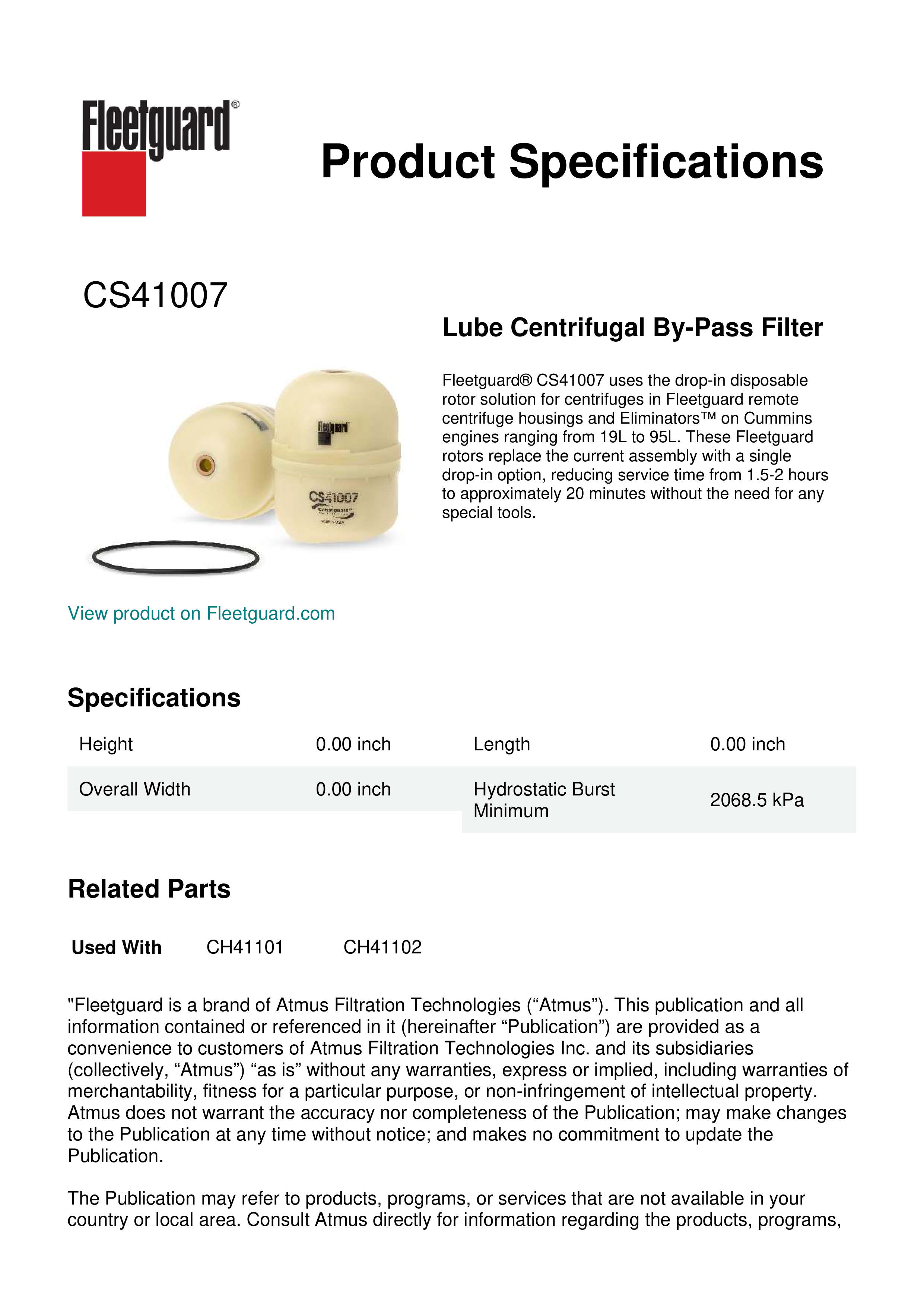 Fleetguard® CS41007 uses the drop-in disposable rotor solution for centrifuges in Fleetguard remote centrifuge housings and Eliminators™ on Cummins engines ranging from 19L to 95L. These Fleetguard rotors replace the current assembly with a single drop-in option, reducing service time from 1.5-2 hours to approximately 20 minutes without the need for any special tools.Specification