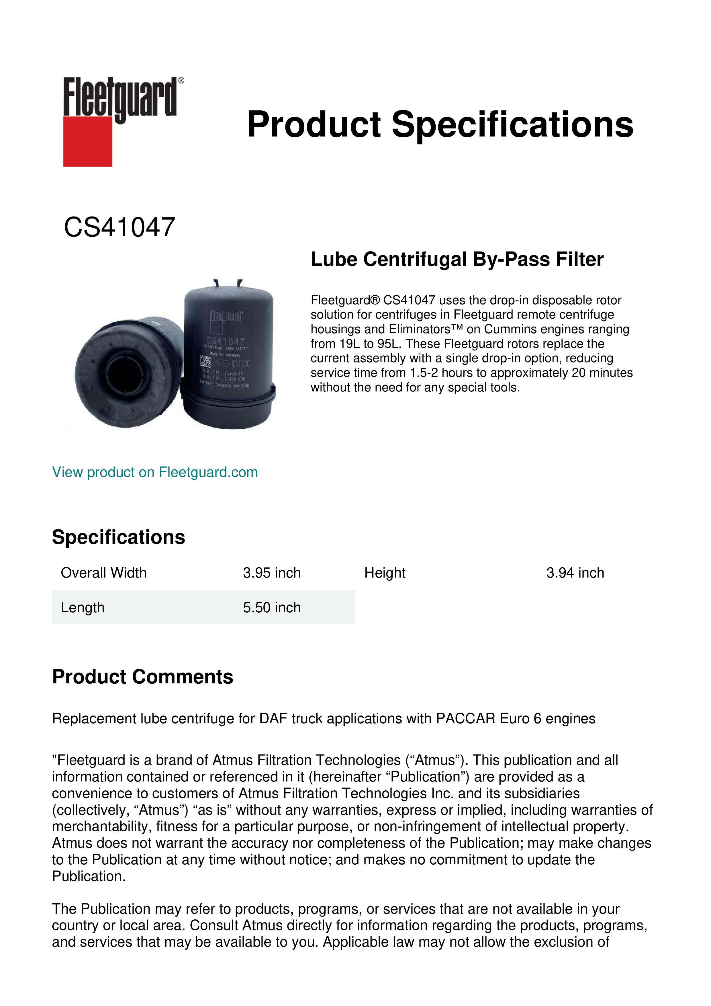 Fleetguard® CS41047 uses the drop-in disposable rotor solution for centrifuges in Fleetguard remote centrifuge housings and Eliminators™ on Cummins engines ranging from 19L to 95L. These Fleetguard rotors replace the current assembly with a single drop-in option, reducing service time from 1.5-2 hours to approximately 20 minutes without the need for any special tools.Specification