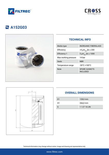 Genuine Filtrec A152G03. This Filtrec element is designed to meet or exceed the quality and performance of brand OEM’s ensuring superior filtration performance and long-lasting durability.