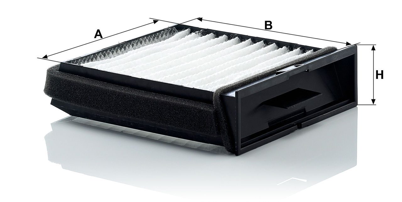 High-quality MANN-FILTER cabin filters offer almost 100% protection against particles such as pollen, diesel soot and tyre abrasion - for a feel-good climate in the vehicle interior and protection of the air conditioning system. Exact fit and perfect tightness ensure constant filtration performance during the entire service interval / Optimum vehicle interior ventilation due to the high air flow capacity.Specification