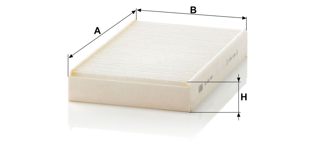 High-quality MANN-FILTER cabin filters offer almost 100% protection against particles such as pollen, diesel soot and tyre abrasion - for a feel-good climate in the vehicle interior and protection of the air conditioning system. Exact fit and perfect tightness ensure constant filtration performance during the entire service interval / Optimum vehicle interior ventilation due to the high air flow capacity.