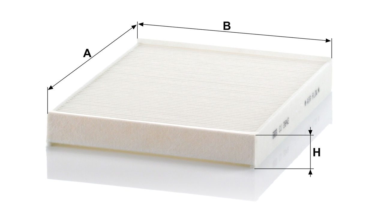 High-quality MANN-FILTER cabin filters offer almost 100% protection against particles such as pollen, diesel soot and tyre abrasion - for a feel-good climate in the vehicle interior and protection of the air conditioning system. Exact fit and perfect tightness ensure constant filtration performance during the entire service interval / Optimum vehicle interior ventilation due to the high air flow capacity.