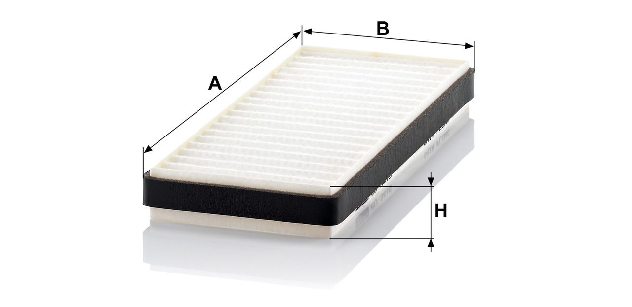 High-quality MANN-FILTER cabin filters offer almost 100% protection against particles such as pollen, diesel soot and tyre abrasion - for a feel-good climate in the vehicle interior and protection of the air conditioning system. Exact fit and perfect tightness ensure constant filtration performance during the entire service interval / Optimum vehicle interior ventilation due to the high air flow capacity.