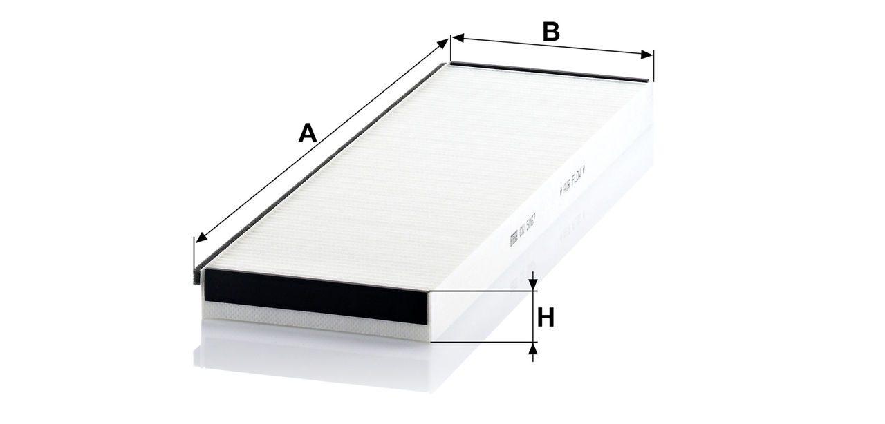 High-quality MANN-FILTER cabin filters offer almost 100% protection against particles such as pollen, diesel soot and tyre abrasion - for a feel-good climate in the vehicle interior and protection of the air conditioning system. Exact fit and perfect tightness ensure constant filtration performance during the entire service interval / Optimum vehicle interior ventilation due to the high air flow capacity.