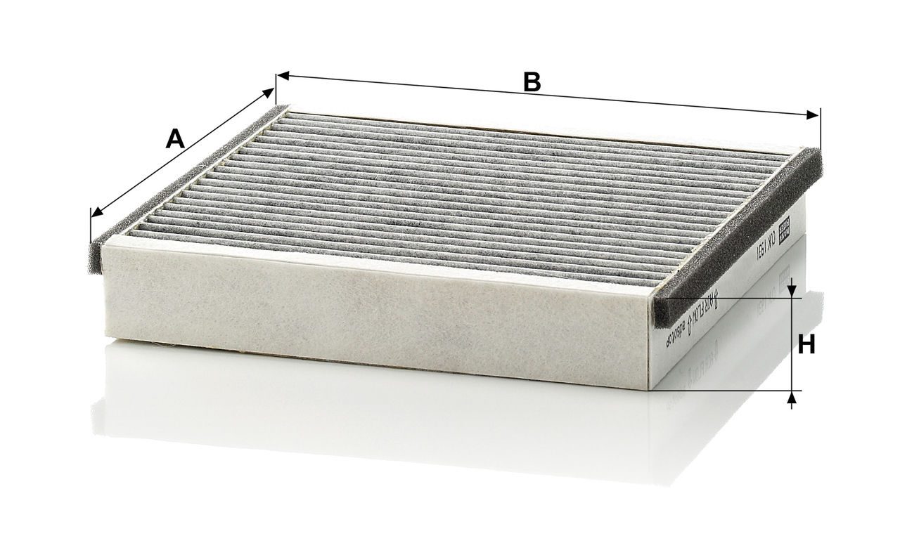 High-quality MANN-FILTER cabin filters with active carbon - nearly 100% protection from particles like pollen, diesel soot & tyre abrasion / Additional protection from harmful gases & unpleasant odour. The trated highly-effective activated carbon gives protection against harmful gases such as ozone, nitrogen oxide or sulphur dioxide and eliminates unpleasant odours during the entire service interval.Specification