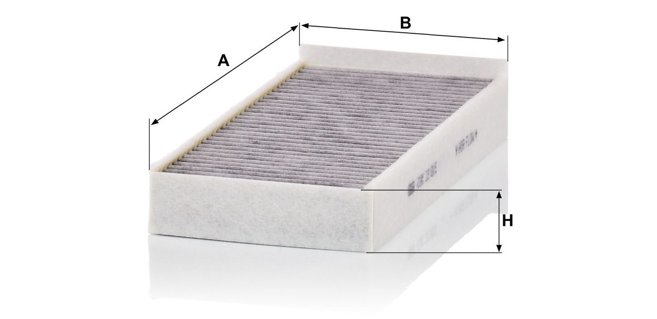 High-quality MANN-FILTER cabin filters with active carbon - nearly 100% protection from particles like pollen, diesel soot & tyre abrasion / Additional protection from harmful gases & unpleasant odour. The trated highly-effective activated carbon gives protection against harmful gases such as ozone, nitrogen oxide or sulphur dioxide and eliminates unpleasant odours during the entire service interval.