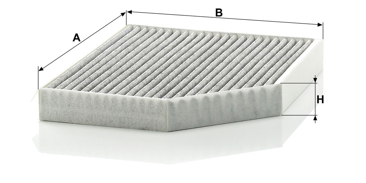 High-quality MANN-FILTER cabin filters with active carbon - nearly 100% protection from particles like pollen, diesel soot & tyre abrasion / Additional protection from harmful gases & unpleasant odour. The trated highly-effective activated carbon gives protection against harmful gases such as ozone, nitrogen oxide or sulphur dioxide and eliminates unpleasant odours during the entire service interval.Specification