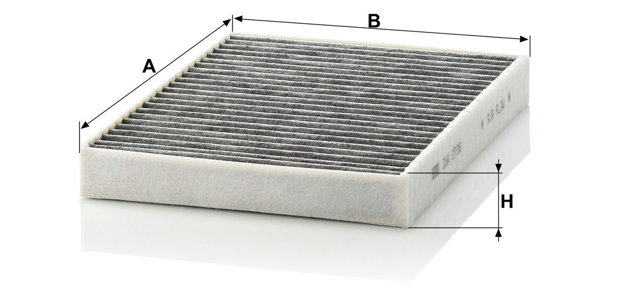 High-quality MANN-FILTER cabin filters with active carbon - nearly 100% protection from particles like pollen, diesel soot & tyre abrasion / Additional protection from harmful gases & unpleasant odour. The trated highly-effective activated carbon gives protection against harmful gases such as ozone, nitrogen oxide or sulphur dioxide and eliminates unpleasant odours during the entire service interval.