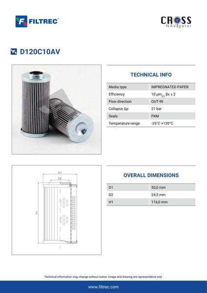 Engineered with their high performance media and a durable design, the D120C10AV provides reliable and consistent performance over its lifespan, even in harsh operating environments. When you order from FilterFinder, you can trust that you are getting a reliable and high-quality replacement filter that will keep your system running smoothly.