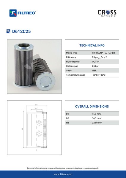 Engineered with their high performance media and a durable design, the D612C25 provides reliable and consistent performance over its lifespan, even in harsh operating environments. When you order from FilterFinder, you can trust that you are getting a reliable and high-quality replacement filter that will keep your system running smoothly.