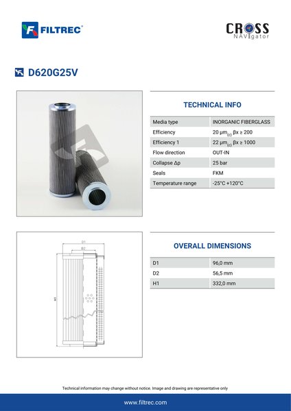 Engineered with their high performance media and a durable design, the D620G25V provides reliable and consistent performance over its lifespan, even in harsh operating environments. When you order from FilterFinder, you can trust that you are getting a reliable and high-quality replacement filter that will keep your system running smoothly.
