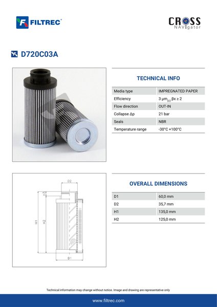 Genuine Filtrec D720C03A. This Filtrec element is designed to meet or exceed the quality and performance of brand OEM’s ensuring superior filtration performance and long-lasting durability.