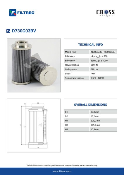 Genuine Filtrec D730G03BV. This Filtrec element is designed to meet or exceed the quality and performance of brand OEM’s ensuring superior filtration performance and long-lasting durability.Engineered with their high performance media and a durable design, the D730G03BV provides reliable and consistent performance over its lifespan, even in harsh operating environments. When you order from FilterFinder, you can trust that you are getting a reliable and high-quality replacement filter that will keep your system running smoothly.