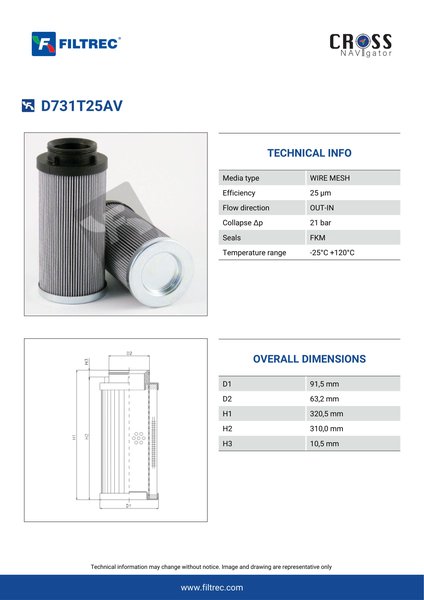 Engineered with their high performance media and a durable design, the D731T25AV provides reliable and consistent performance over its lifespan, even in harsh operating environments. When you order from FilterFinder, you can trust that you are getting a reliable and high-quality replacement filter that will keep your system running smoothly.