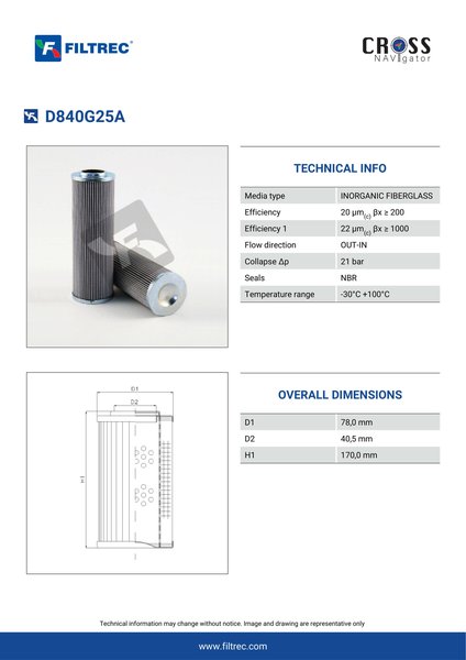 Genuine Filtrec D840G25A. This Filtrec element is designed to meet or exceed the quality and performance of brand OEM’s ensuring superior filtration performance and long-lasting durability.