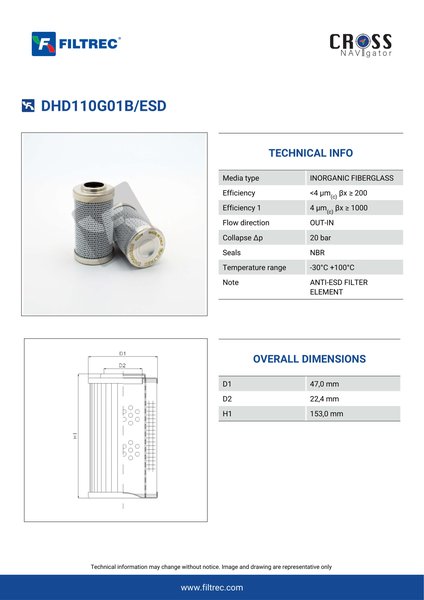Genuine Filtrec DHD110G01B/ESD. This Filtrec element is designed to meet or exceed the quality and performance of brand OEM’s ensuring superior filtration performance and long-lasting durability.Engineered with their high performance media and a durable design, the DHD110G01B/ESD provides reliable and consistent performance over its lifespan, even in harsh operating environments. When you order from FilterFinder, you can trust that you are getting a reliable and high-quality replacement filter that will keep your system running smoothly.