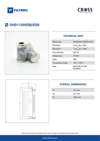 Genuine Filtrec DHD110H05B/ESD. This Filtrec element is designed to meet or exceed the quality and performance of brand OEM’s ensuring superior filtration performance and long-lasting durability.Engineered with their high performance media and a durable design, the DHD110H05B/ESD provides reliable and consistent performance over its lifespan, even in harsh operating environments. When you order from FilterFinder, you can trust that you are getting a reliable and high-quality replacement filter that will keep your system running smoothly.