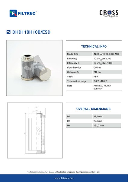 Engineered with their high performance media and a durable design, the DHD110H10B/ESD provides reliable and consistent performance over its lifespan, even in harsh operating environments. When you order from FilterFinder, you can trust that you are getting a reliable and high-quality replacement filter that will keep your system running smoothly.