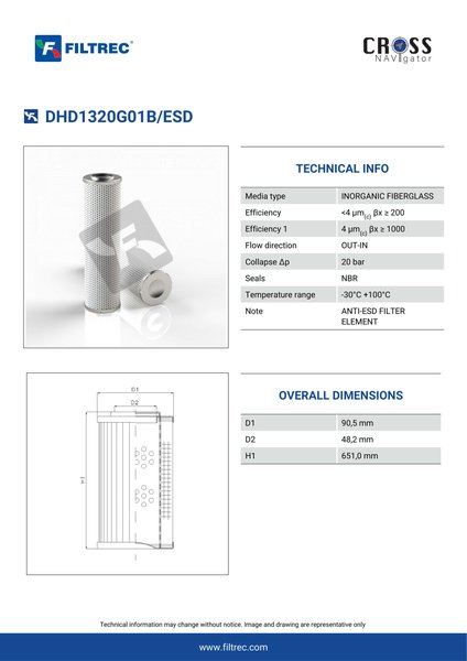 The efficiency of the element is shown using the Micron (µ) and Beta (β) ratings. The micron rating indicates the size of the particle being filtered and the beta rating the efficiency, calculated as 1/β.