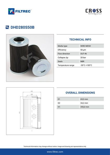 Genuine Filtrec DHD280S50B. This Filtrec element is designed to meet or exceed the quality and performance of brand OEM’s ensuring superior filtration performance and long-lasting durability.