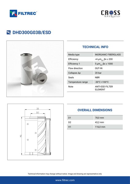 Genuine Filtrec DHD300G03B/ESD. This Filtrec element is designed to meet or exceed the quality and performance of brand OEM’s ensuring superior filtration performance and long-lasting durability.Engineered with their high performance media and a durable design, the DHD300G03B/ESD provides reliable and consistent performance over its lifespan, even in harsh operating environments. When you order from FilterFinder, you can trust that you are getting a reliable and high-quality replacement filter that will keep your system running smoothly.