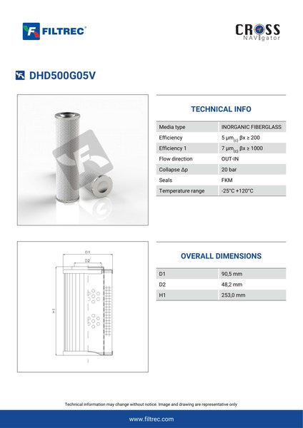 Genuine Filtrec DHD500G05V. This Filtrec element is designed to meet or exceed the quality and performance of brand OEM’s ensuring superior filtration performance and long-lasting durability.