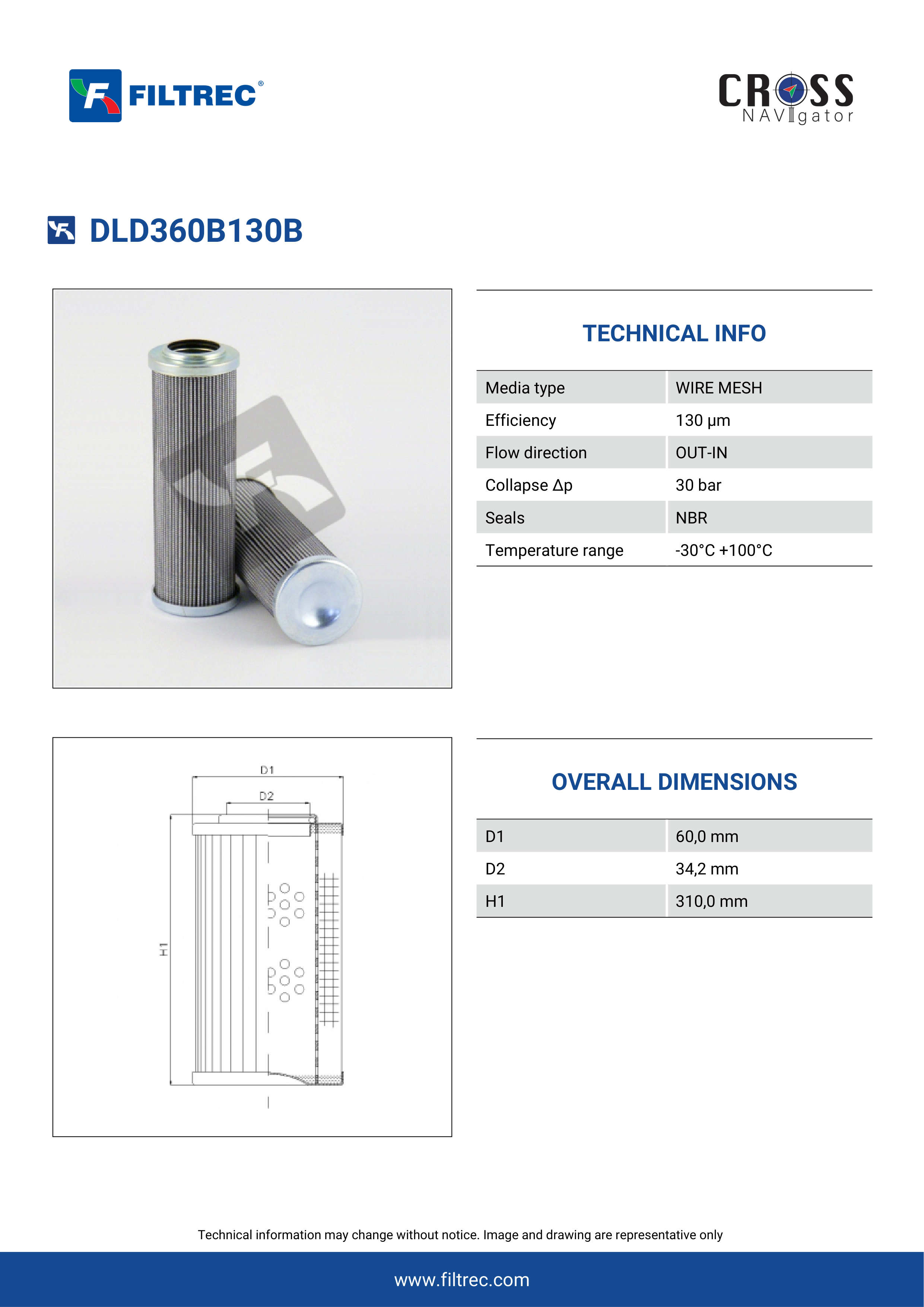 Genuine Filtrec DLD360B130B. This Filtrec element is designed to meet or exceed the quality and performance of brand OEM’s ensuring superior filtration performance and long-lasting durability.