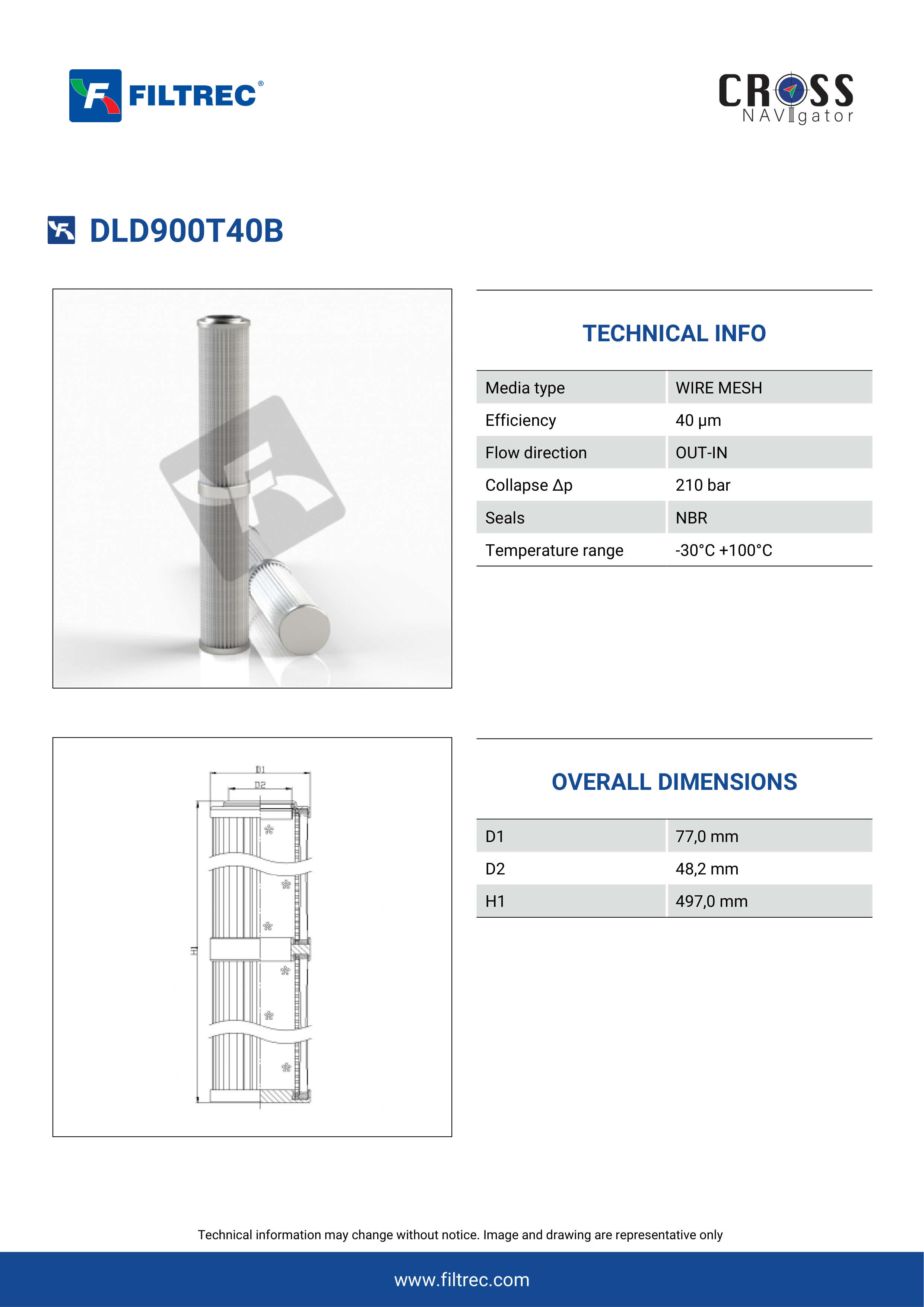 Genuine Filtrec DLD900T40B. This Filtrec element is designed to meet or exceed the quality and performance of brand OEM’s ensuring superior filtration performance and long-lasting durability.