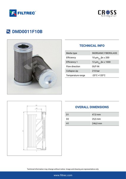 Genuine Filtrec DMD0011F10B. This Filtrec element is designed to meet or exceed the quality and performance of brand OEM’s ensuring superior filtration performance and long-lasting durability.Engineered with their high performance media and a durable design, the DMD0011F10B provides reliable and consistent performance over its lifespan, even in harsh operating environments. When you order from FilterFinder, you can trust that you are getting a reliable and high-quality replacement filter that will keep your system running smoothly.
