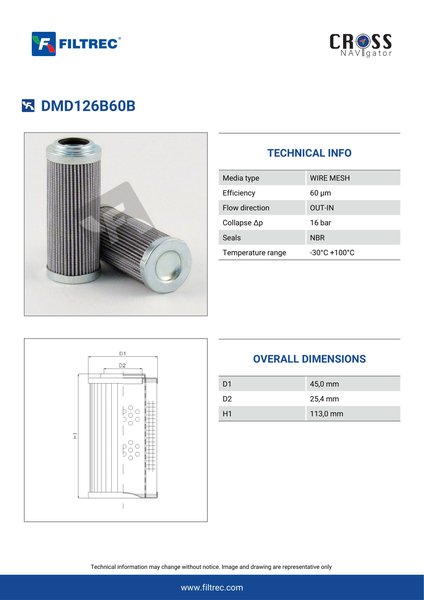 Genuine Filtrec DMD126B60B. This Filtrec element is designed to meet or exceed the quality and performance of brand OEM’s ensuring superior filtration performance and long-lasting durability.