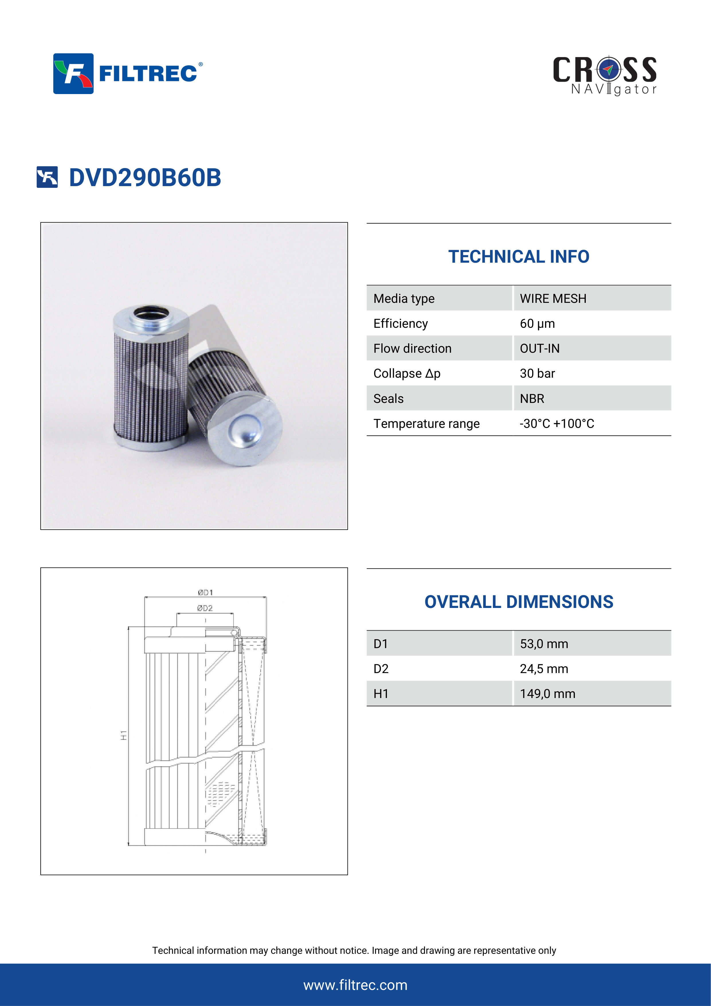 Genuine Filtrec DVD290B60B. This Filtrec element is designed to meet or exceed the quality and performance of brand OEM’s ensuring superior filtration performance and long-lasting durability.