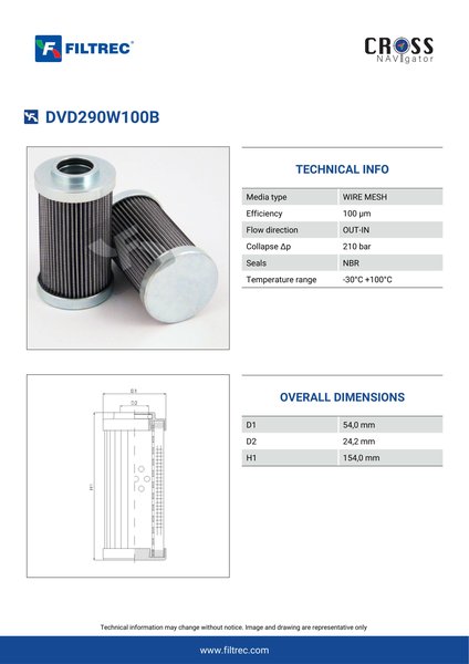 Genuine Filtrec DVD290W100B. This Filtrec element is designed to meet or exceed the quality and performance of brand OEM’s ensuring superior filtration performance and long-lasting durability.