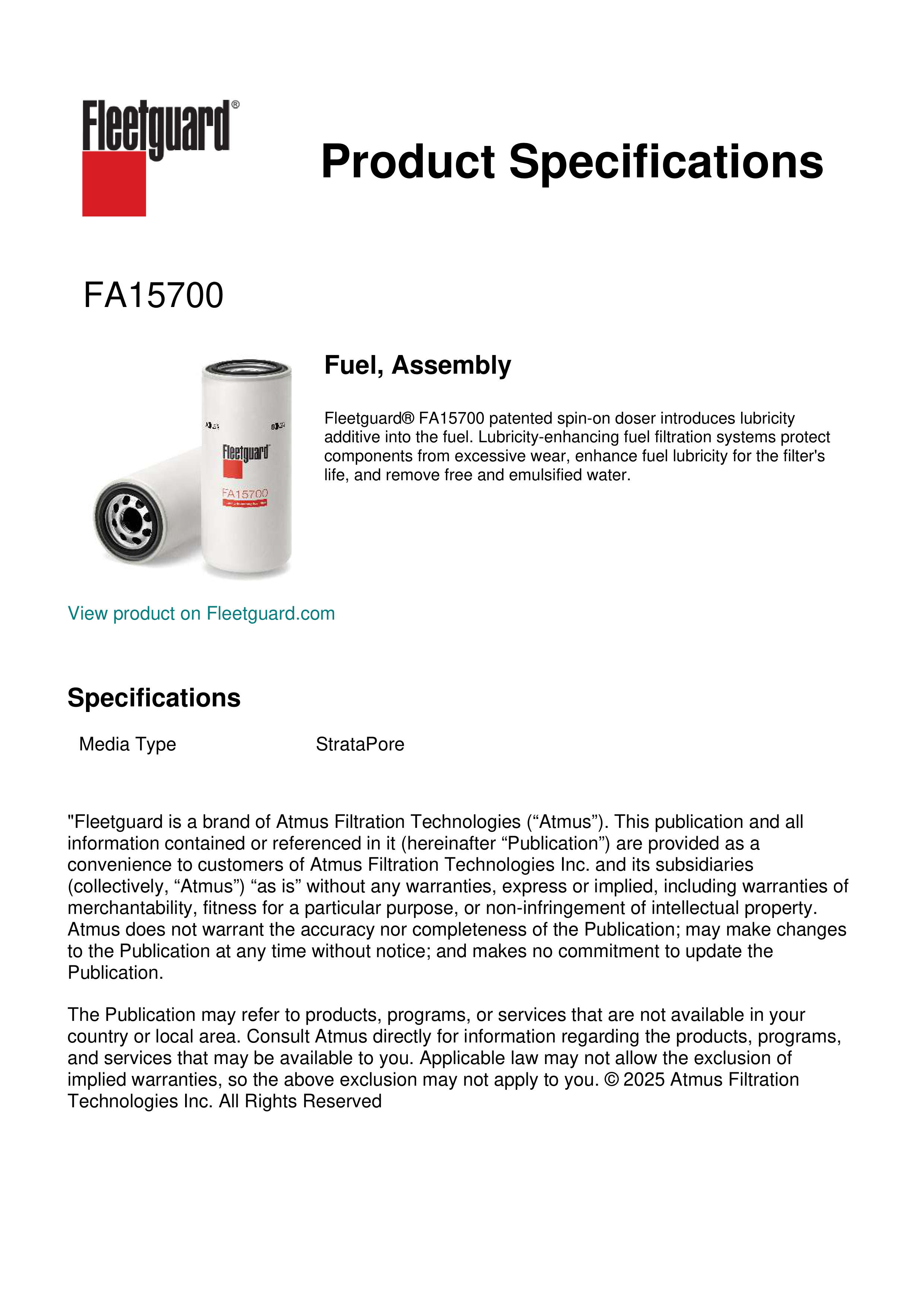 Fleetguard® FA15700 patented spin-on doser introduces lubricity additive into the fuel. Lubricity-enhancing fuel filtration systems protect components from excessive wear, enhance fuel lubricity for the filter's life, and remove free and emulsified water.Specification