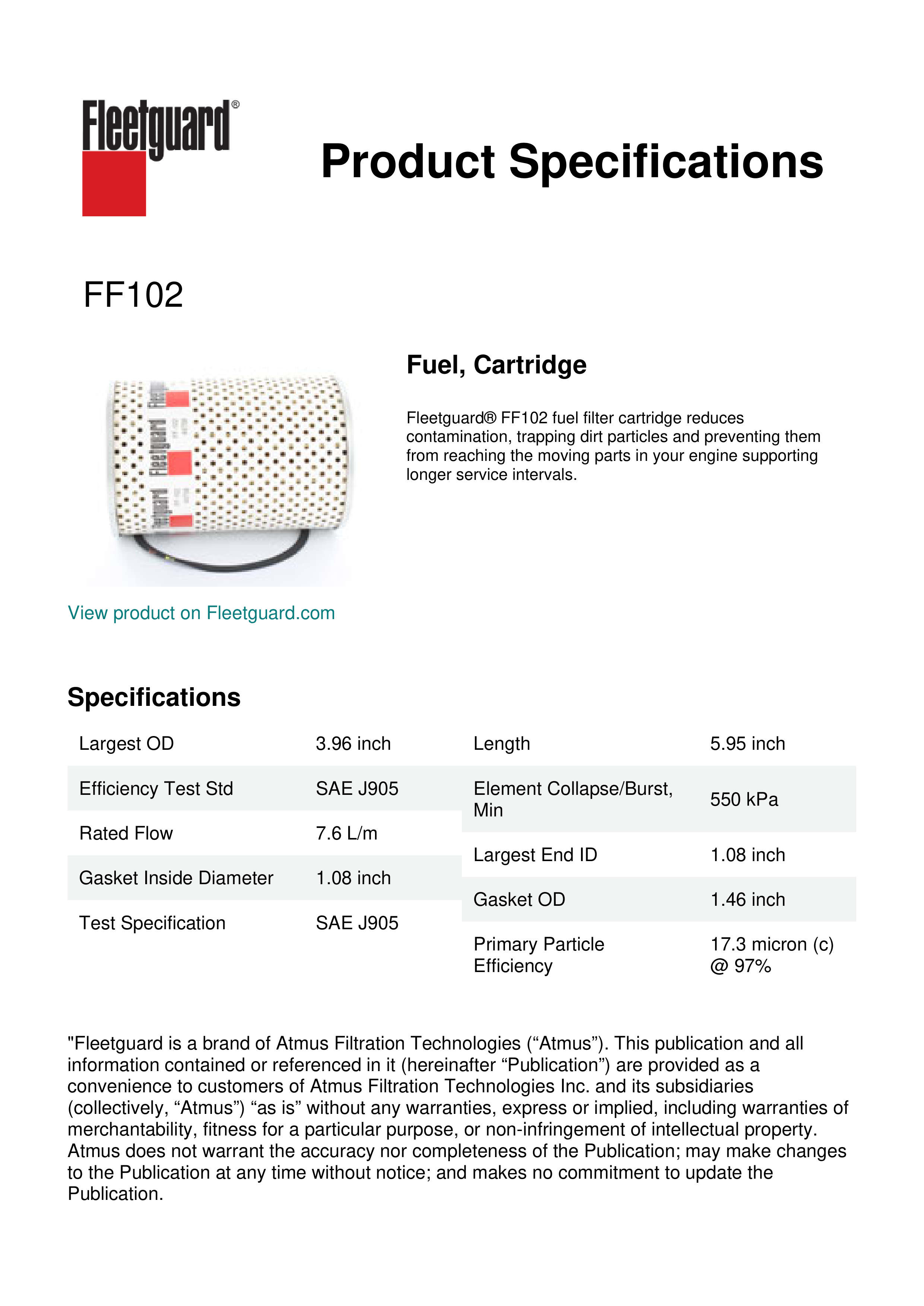 Fleetguard® FF102 fuel filter cartridge reduces contamination, trapping dirt particles and preventing them from reaching the moving parts in your engine supporting longer service intervals.Specification