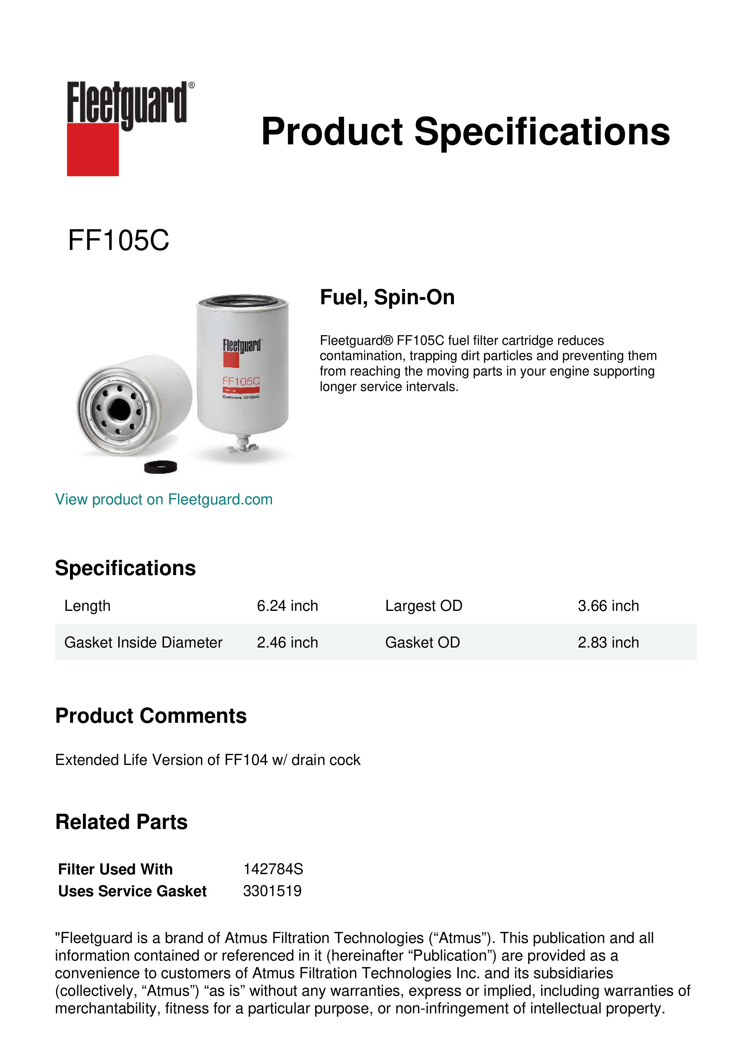 Fleetguard® FF105C fuel filter cartridge reduces contamination, trapping dirt particles and preventing them from reaching the moving parts in your engine supporting longer service intervals.Specification