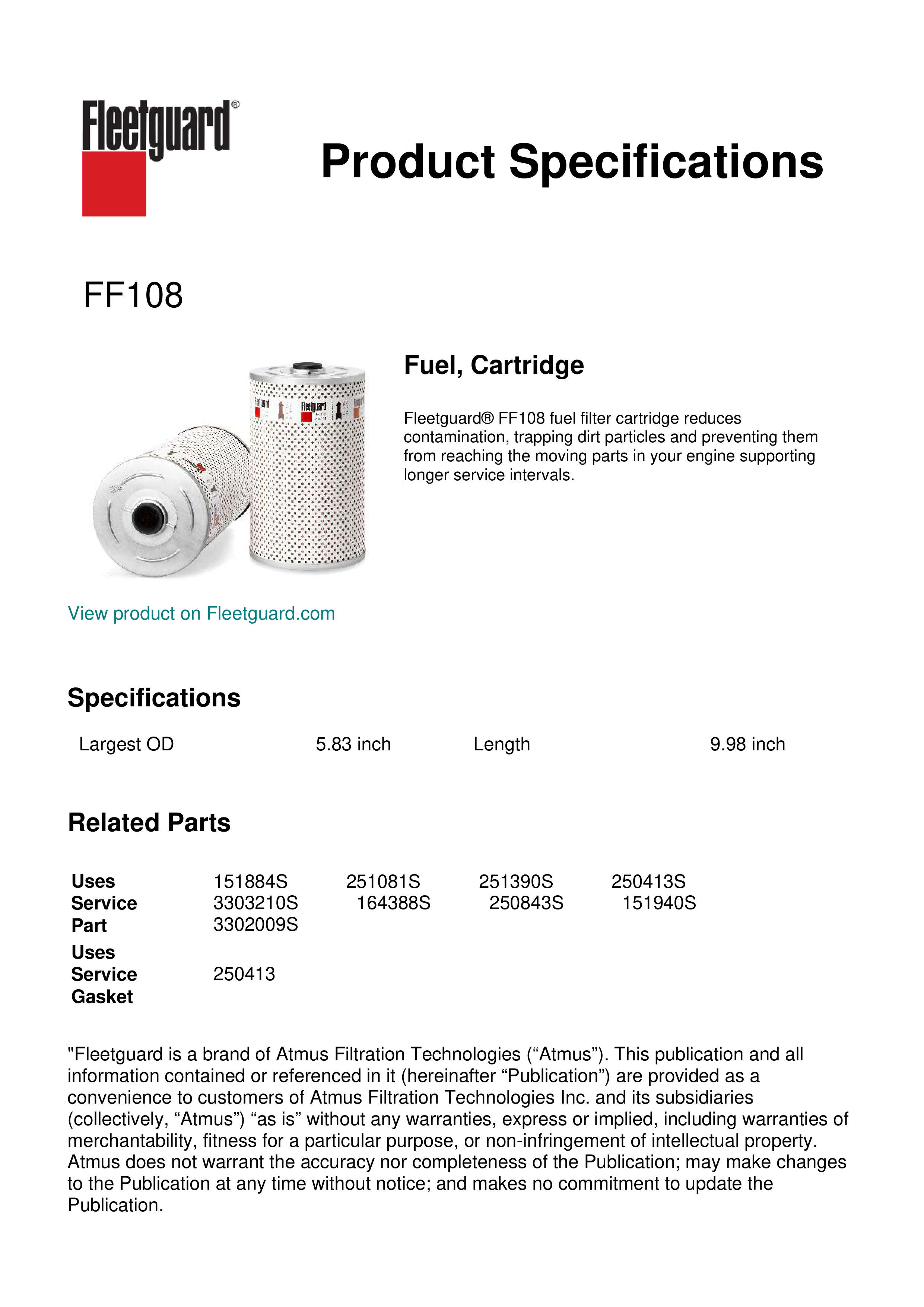 Fleetguard® FF108 fuel filter cartridge reduces contamination, trapping dirt particles and preventing them from reaching the moving parts in your engine supporting longer service intervals.Specification