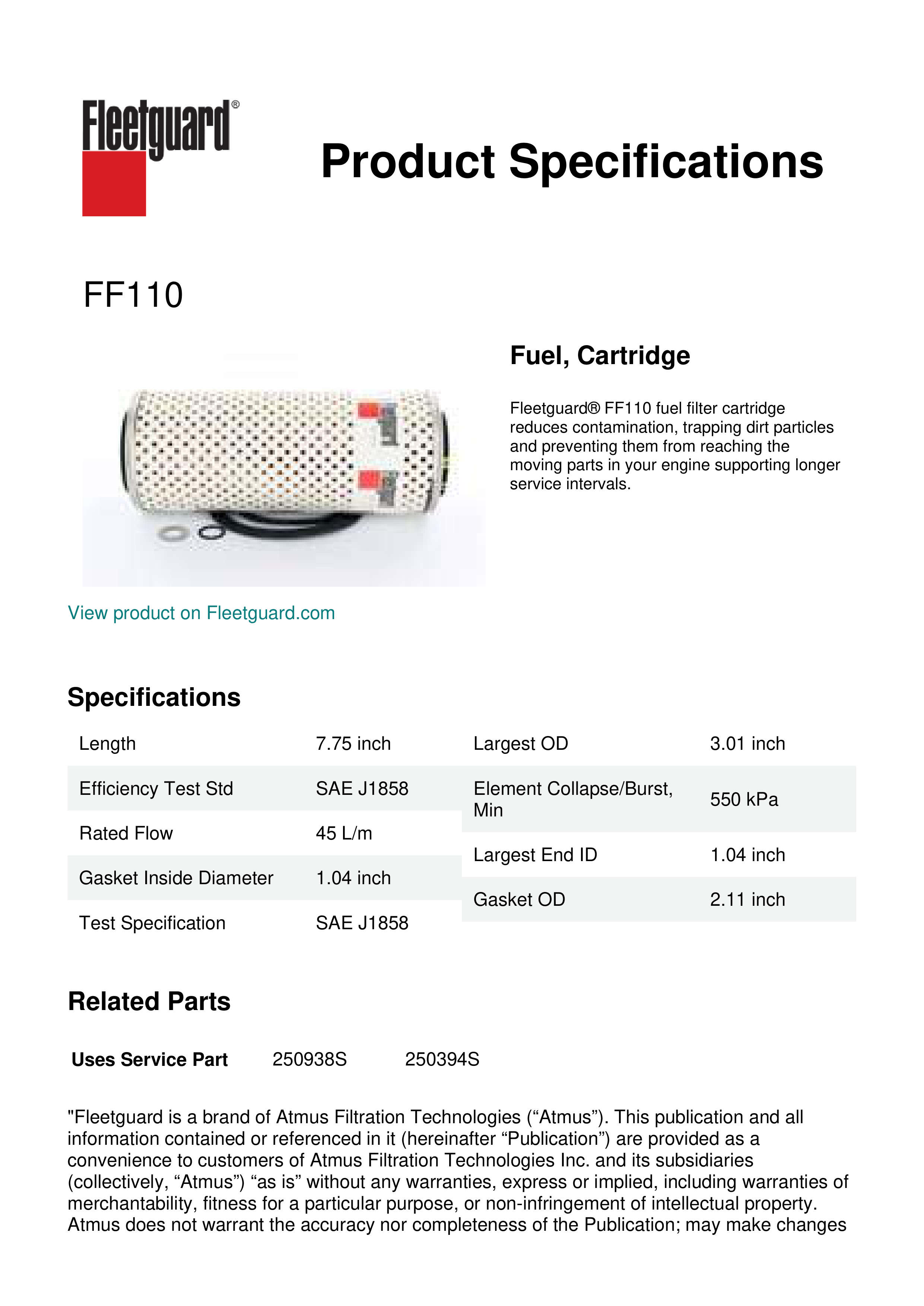 Fleetguard® FF110 fuel filter cartridge reduces contamination, trapping dirt particles and preventing them from reaching the moving parts in your engine supporting longer service intervals.Specification