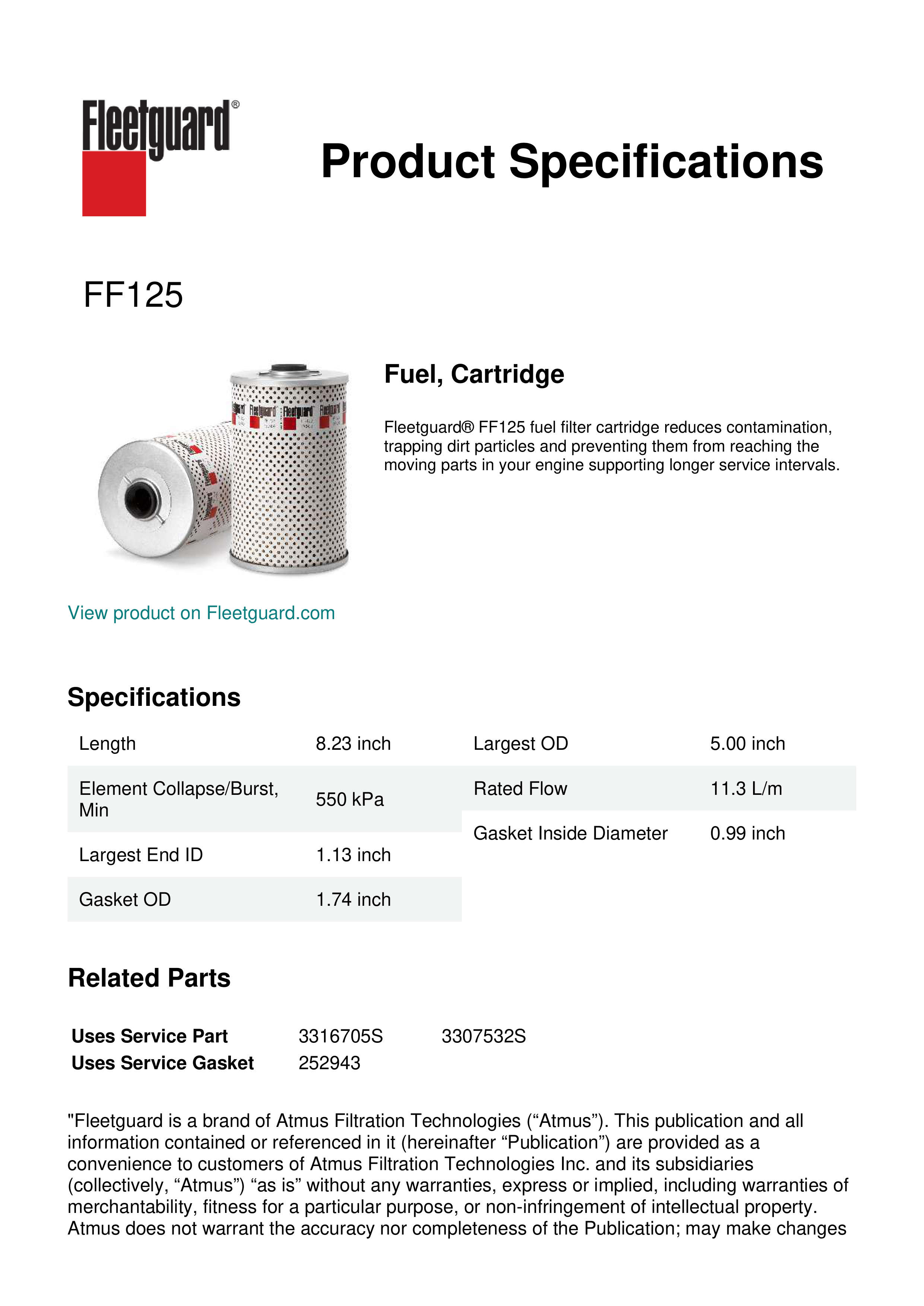 Fleetguard® FF125 fuel filter cartridge reduces contamination, trapping dirt particles and preventing them from reaching the moving parts in your engine supporting longer service intervals.Specification