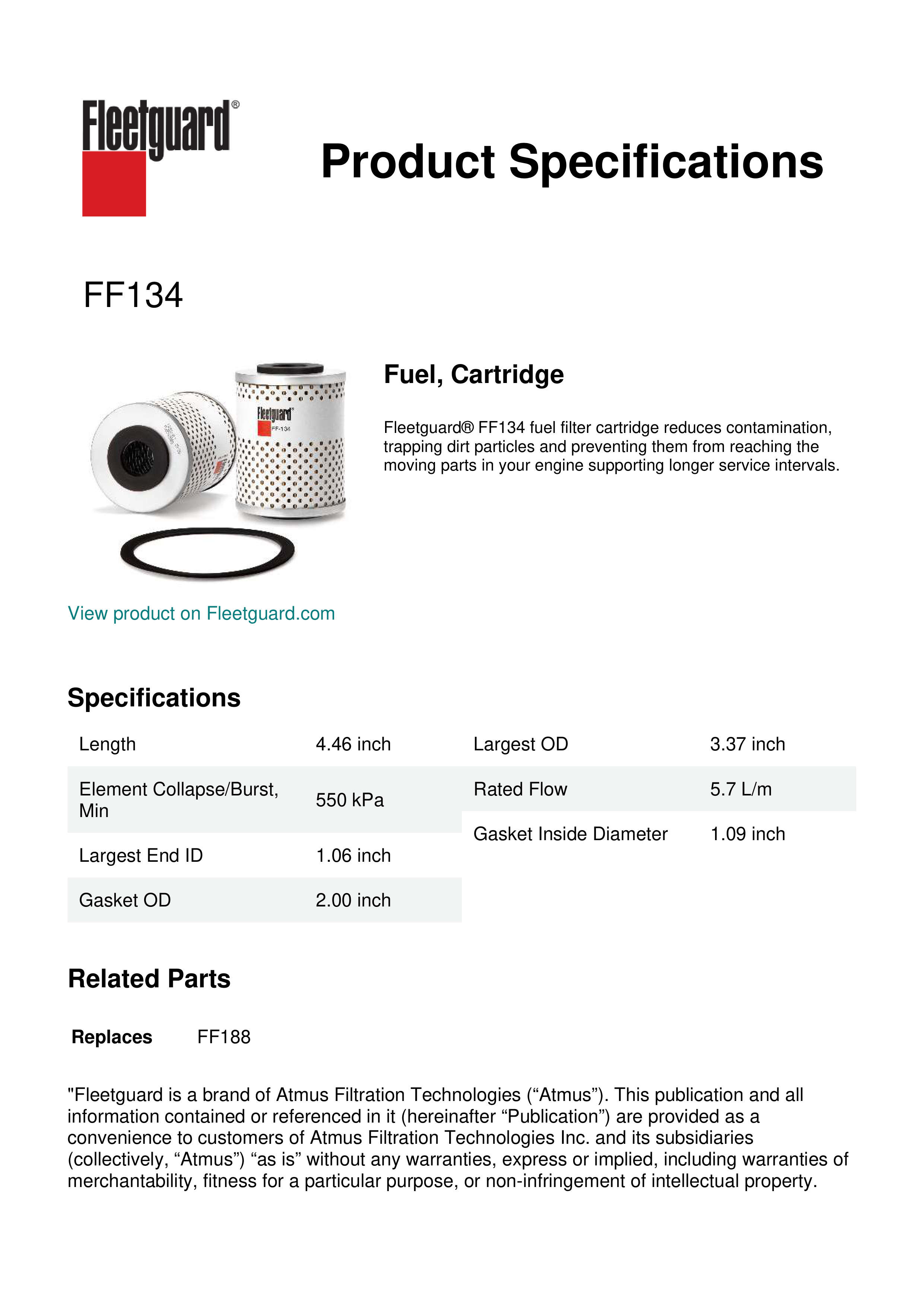 Fleetguard® FF134 fuel filter cartridge reduces contamination, trapping dirt particles and preventing them from reaching the moving parts in your engine supporting longer service intervals.Specification