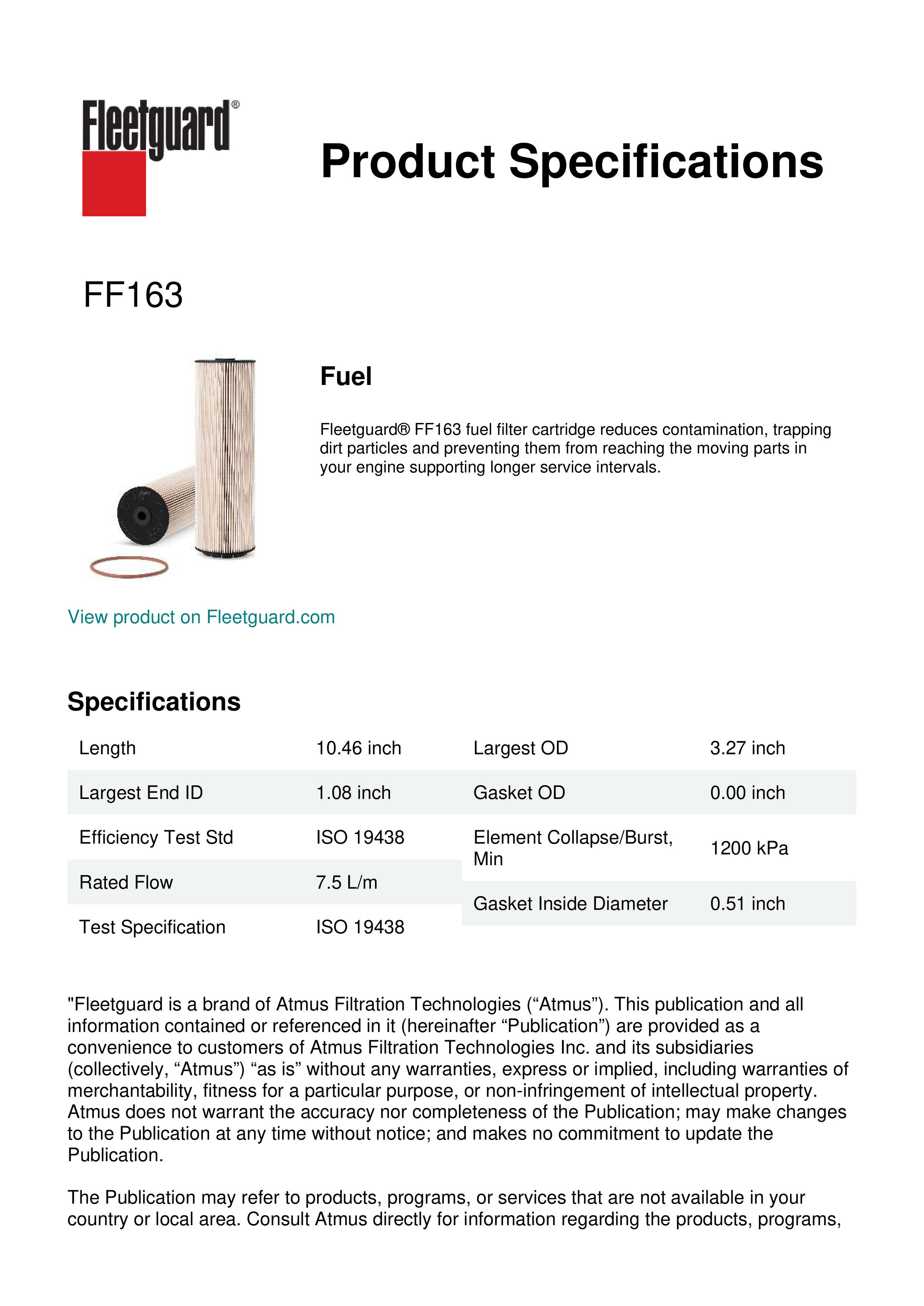 Fleetguard® FF163 fuel filter cartridge reduces contamination, trapping dirt particles and preventing them from reaching the moving parts in your engine supporting longer service intervals.Specification