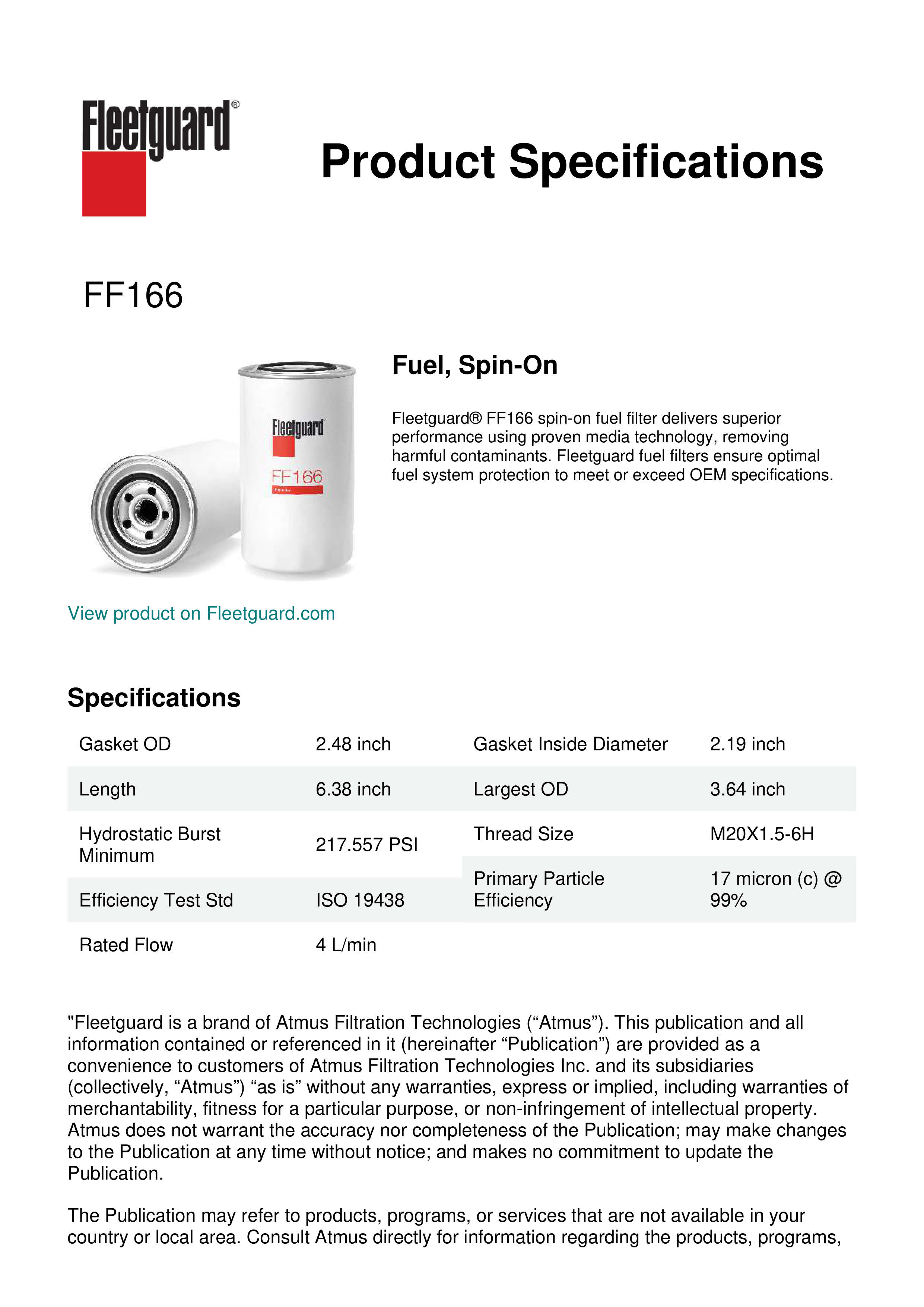 Fleetguard® FF166 spin-on fuel filter delivers superior performance using proven media technology, removing harmful contaminants. Fleetguard fuel filters ensure optimal fuel system protection to meet or exceed OEM specifications.Specification