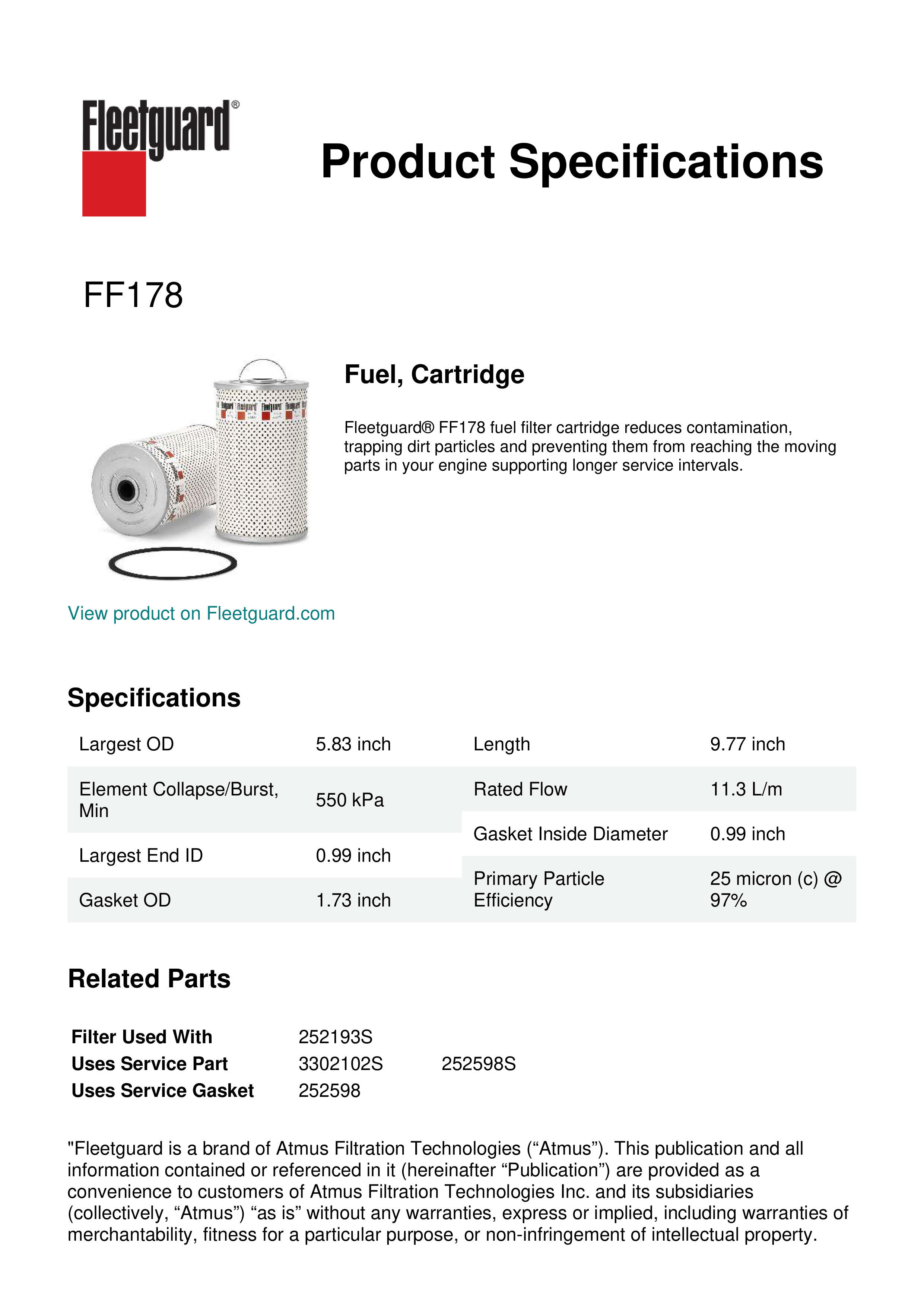 Fleetguard® FF178 fuel filter cartridge reduces contamination, trapping dirt particles and preventing them from reaching the moving parts in your engine supporting longer service intervals.Specification