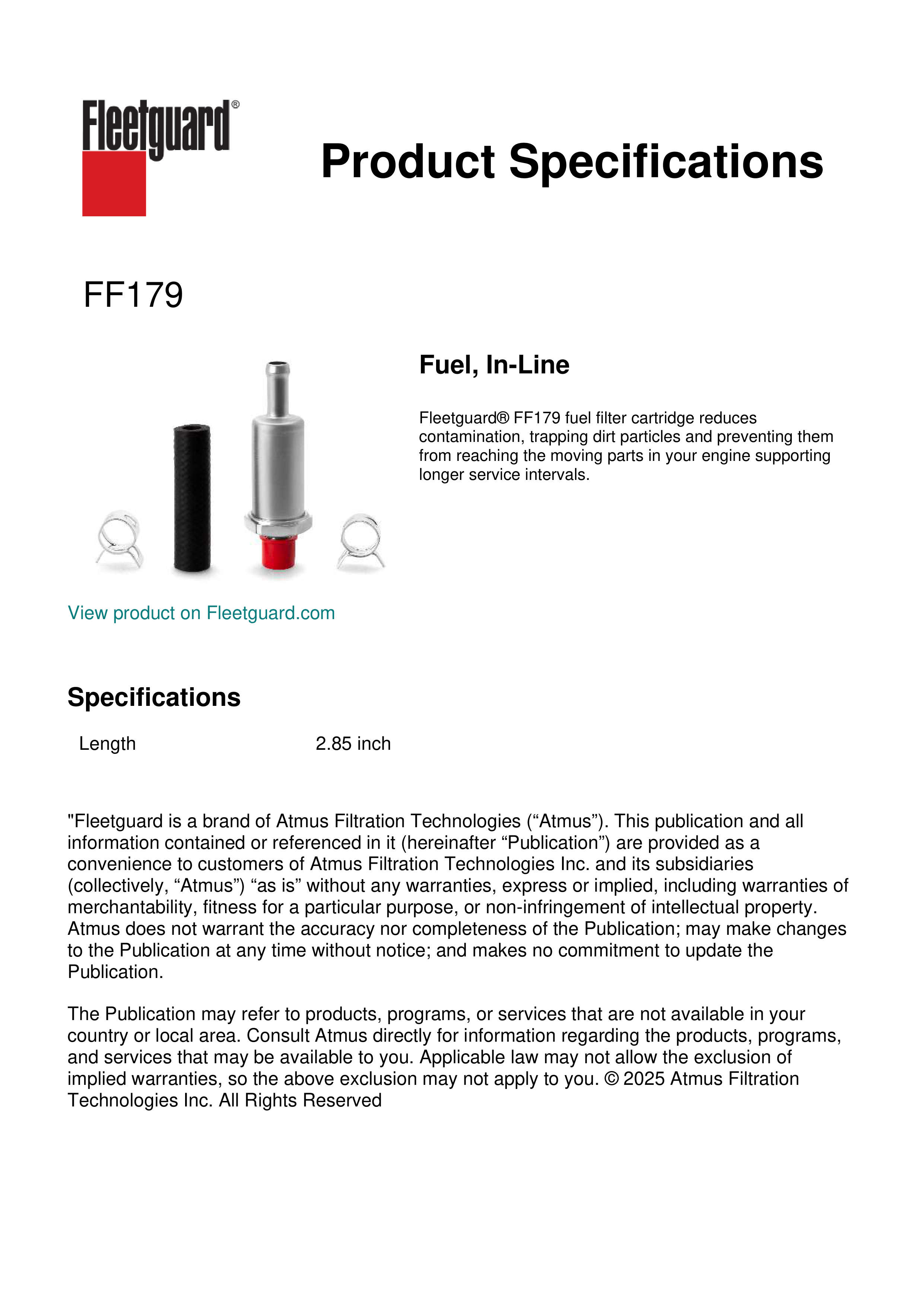 Fleetguard® FF179 fuel filter cartridge reduces contamination, trapping dirt particles and preventing them from reaching the moving parts in your engine supporting longer service intervals.Specification
