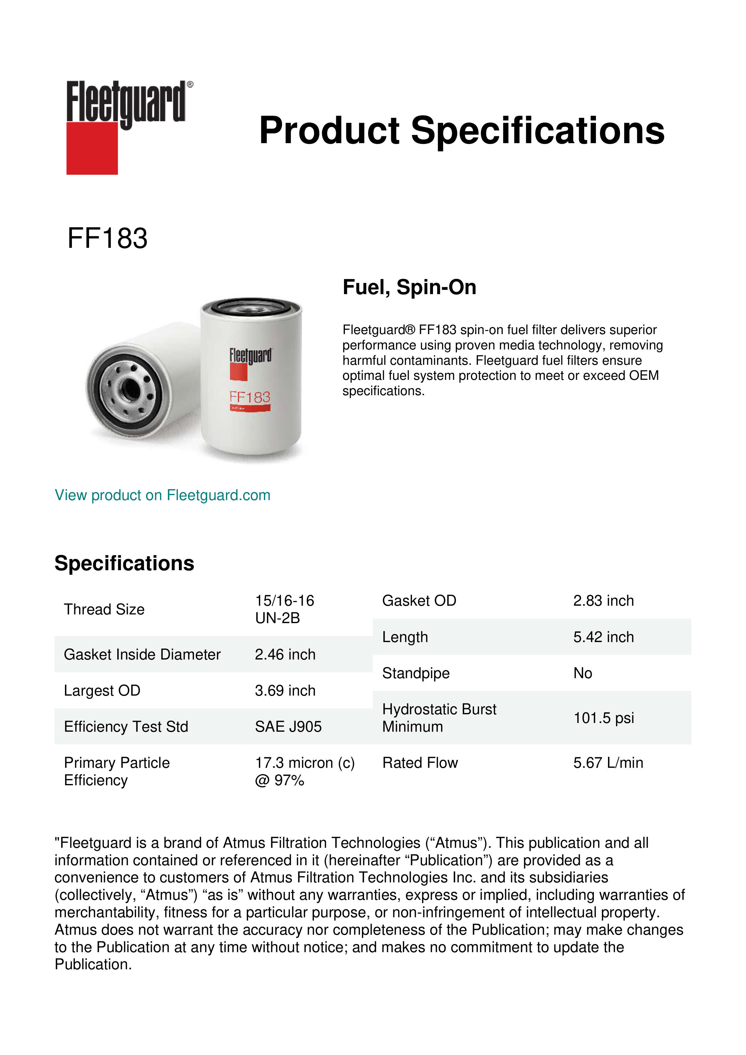 Fleetguard® FF183 spin-on fuel filter delivers superior performance using proven media technology, removing harmful contaminants. Fleetguard fuel filters ensure optimal fuel system protection to meet or exceed OEM specifications.Specification