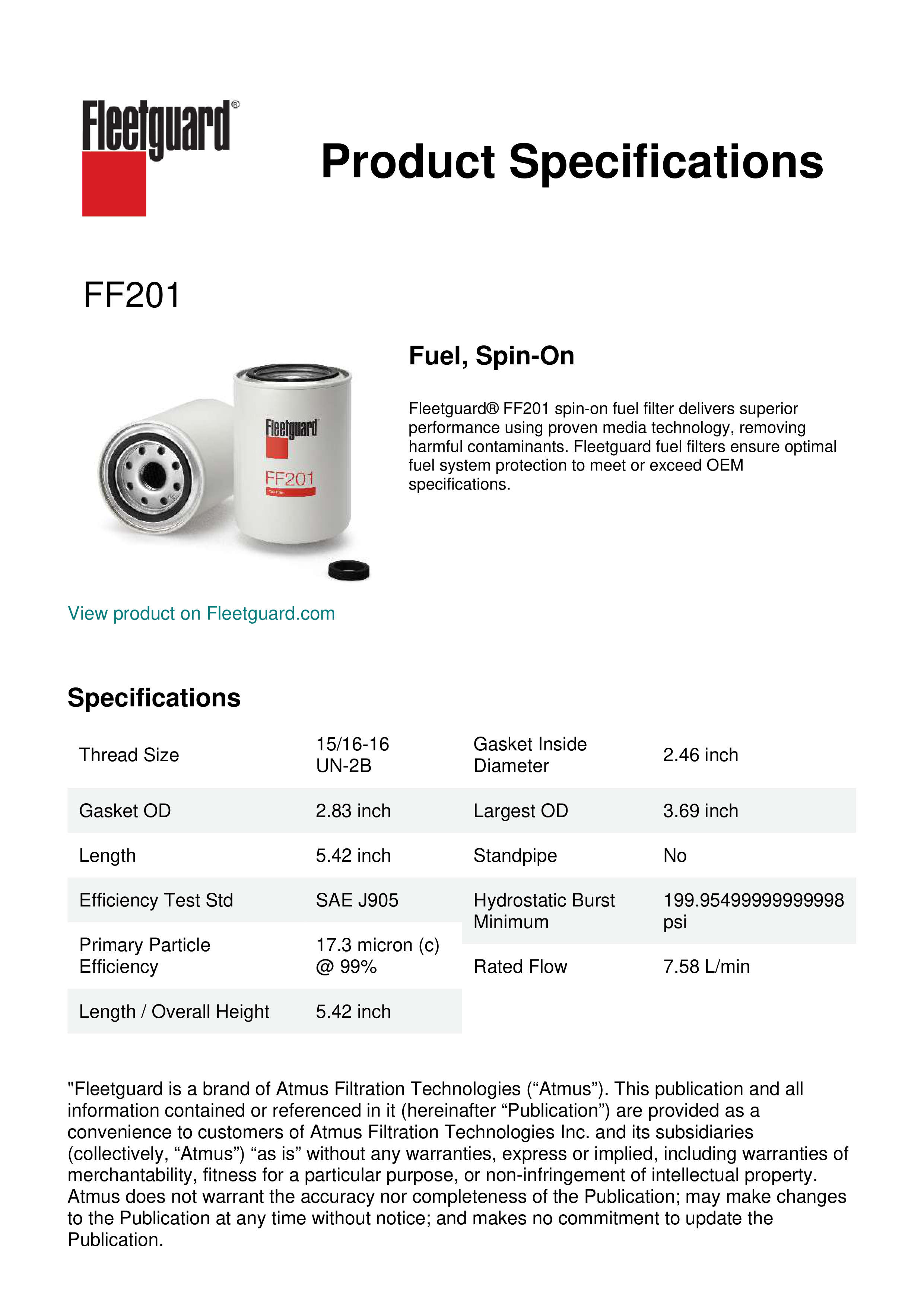 Fleetguard® FF201 spin-on fuel filter delivers superior performance using proven media technology, removing harmful contaminants. Fleetguard fuel filters ensure optimal fuel system protection to meet or exceed OEM specifications.Specification