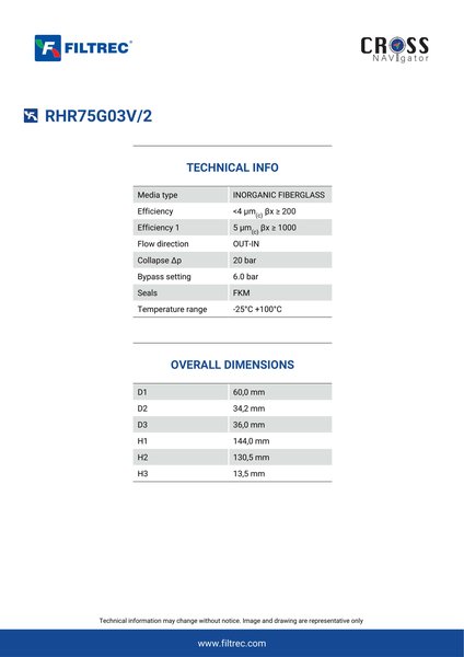 The efficiency of the element is shown using the Micron (µ) and Beta (β) ratings. The micron rating indicates the size of the particle being filtered and the beta rating the efficiency, calculated as 1/β.