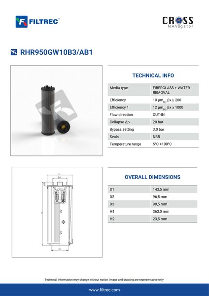 The efficiency of the element is shown using the Micron (µ) and Beta (β) ratings. The micron rating indicates the size of the particle being filtered and the beta rating the efficiency, calculated as 1/β.